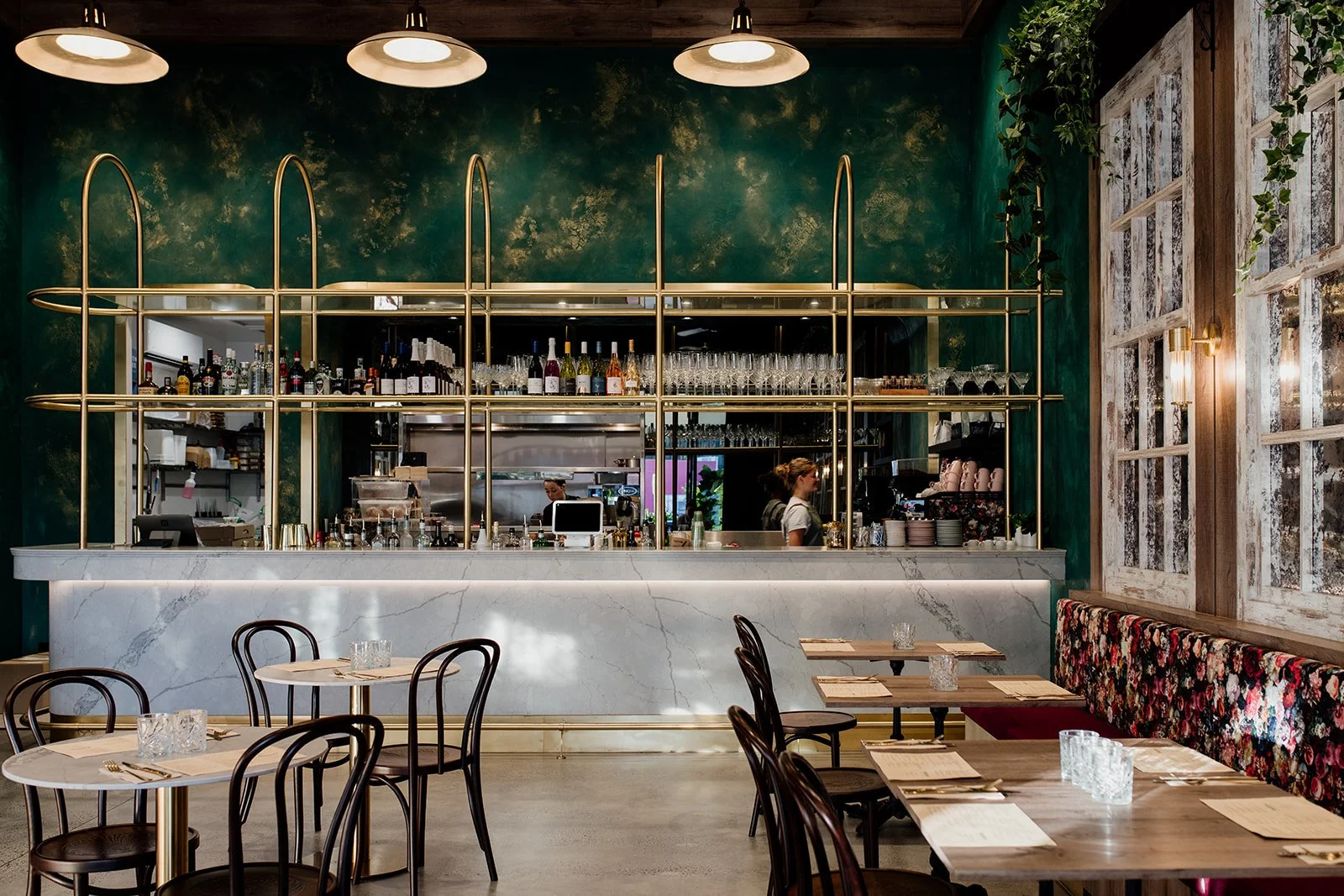 The hero is the custom made curved brushed gold bar gantry with the gorgeous emerald green and gold impression backdrop. The bar is lined with custom designed marble contour panels with a heritage edged detail. French-styled sash windows adorned with lush greenery and floral banquette seating creates an idyllic dining ambience.